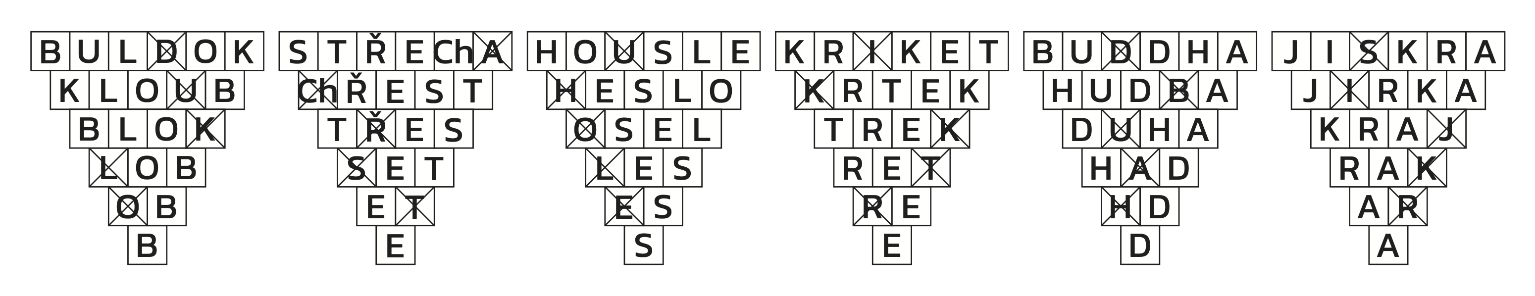 Všimneme si, že slova mají někdy podobná písmena, a také délky 2, 3, 4, 5 nebo 6 písmen stejně jako řádky v “trychtýřích” pod nimi. Stačí je tedy do trychtýřů doplnit tak, aby vždy platilo, že škrnuté písmeno zmizí a nějakou permutací zbylých písmen vznikne slovo na dalším řádku. Nakonec se škrtne vždy jedno ze dvou písmen v dvouslovných slovech a zbylá jednotlivá písmena přečteme: BESEDA.