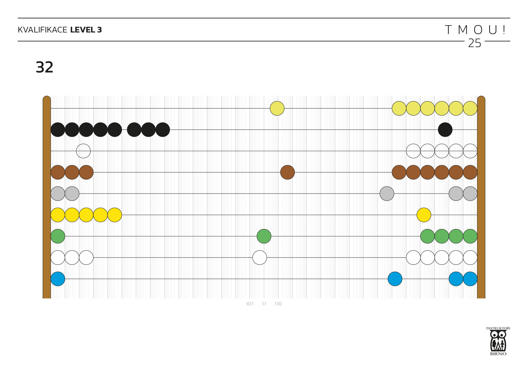 V šifře vidíme abakus, za kterým je logaritmická stupince. Čísla pod stupnicí napovídají, že půjde o nějaké poměry, rozsah je zhruba od 1015:1 po 1:1015. Každý řádek obsahuje jednu „volnou“ kuličku, která je někde na této stupnici, zbylé kuličky jsou natlačené co nejvíc doleva či doprava (s výjimkou černého řádku).