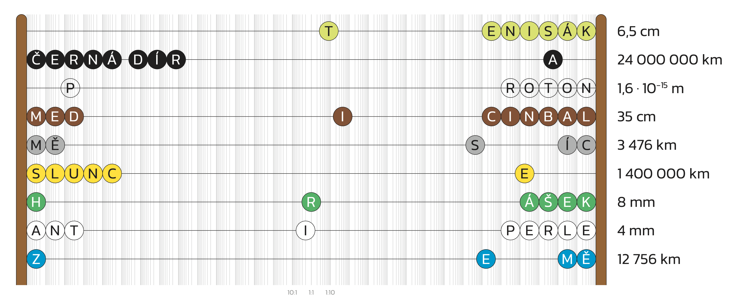 Každý řádek tedy obsahuje následující informace: barvu kuliček, počet kuliček, kolikátá kulička je “volná” a přesnou polohu volné kuličky označující nějaký poměr od 1015:1 po 1:1015. Poměr tedy říká, jak velká je kulička na papíře oproti skutečnosti (podle logiky mapového měřítka, tedy poměr x:y znamená x jednotek na papíře je y jednotek ve skutečnosti). Stačí tedy všechny koule na základě barvy, velikosti a počtu písmen pojmenovat. Například zelená kulička je na poměru 1:1, má tedy v realitě stejnou velikost jako na papíře (8 mm), a je na 6 písmen – to musí být hrášek.