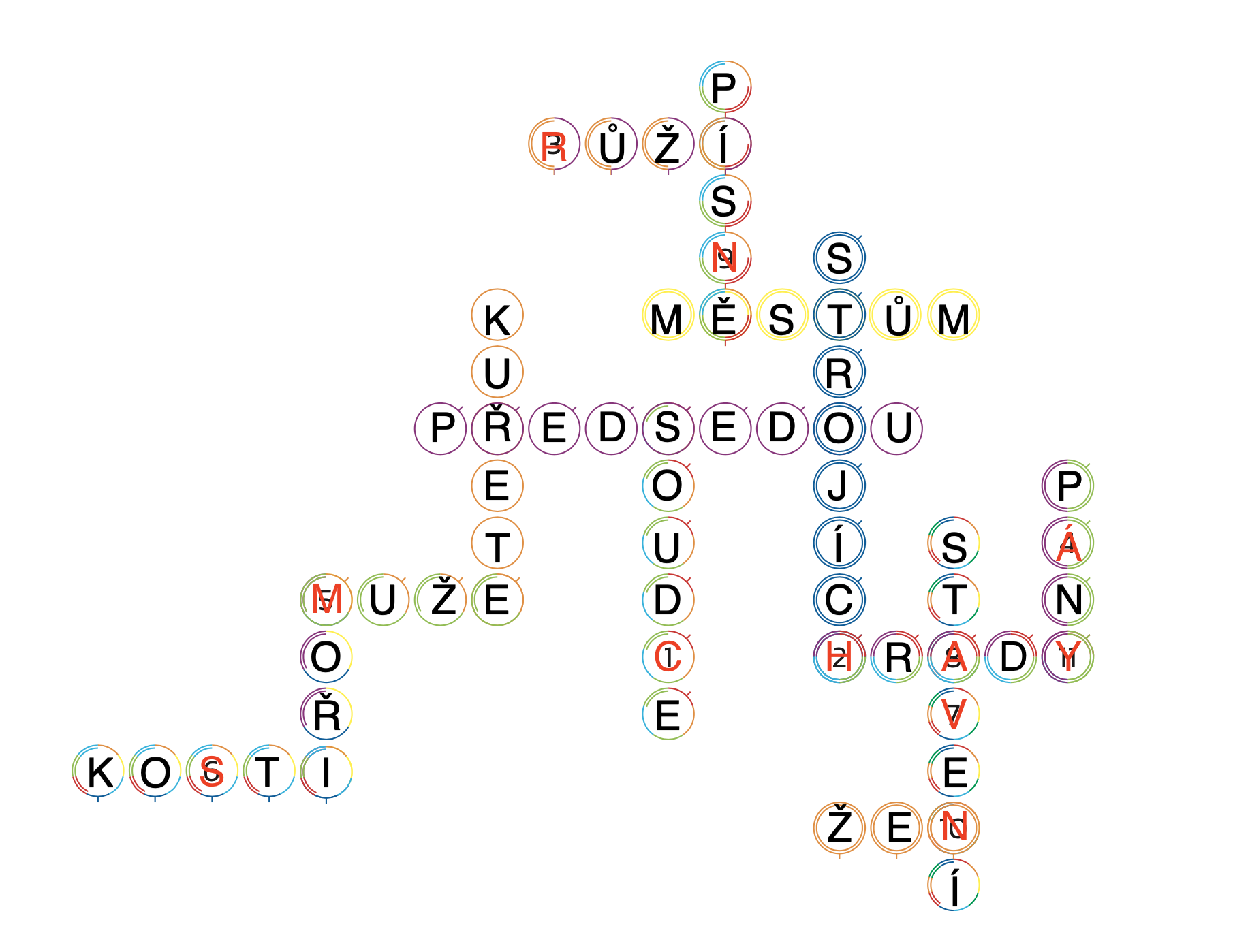 Každé slovo je vytvořené ze stejných koleček (překrývající se kolečka vypadají sice jinak, ale jsou to pouze překrytá kolečka ze dvou slov). Slova tedy definují informace, v kolečkách. Ty jsou dvojího typu: