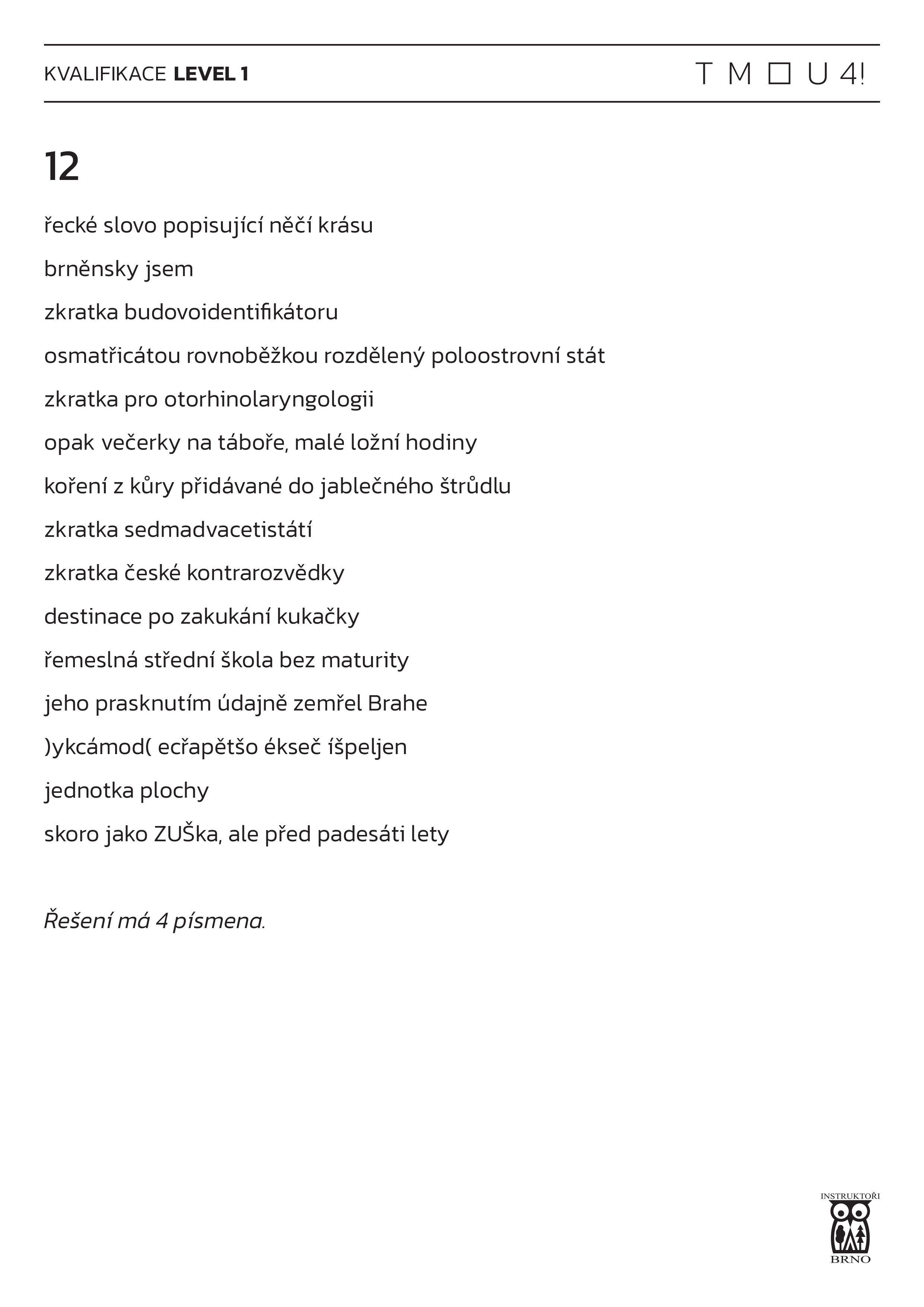 Na hře se používala TMOU 4! pomůcka a 24písmenná anglická abeceda bez Q a W. Řešením šifry je podstatné jméno v prvním pádě.