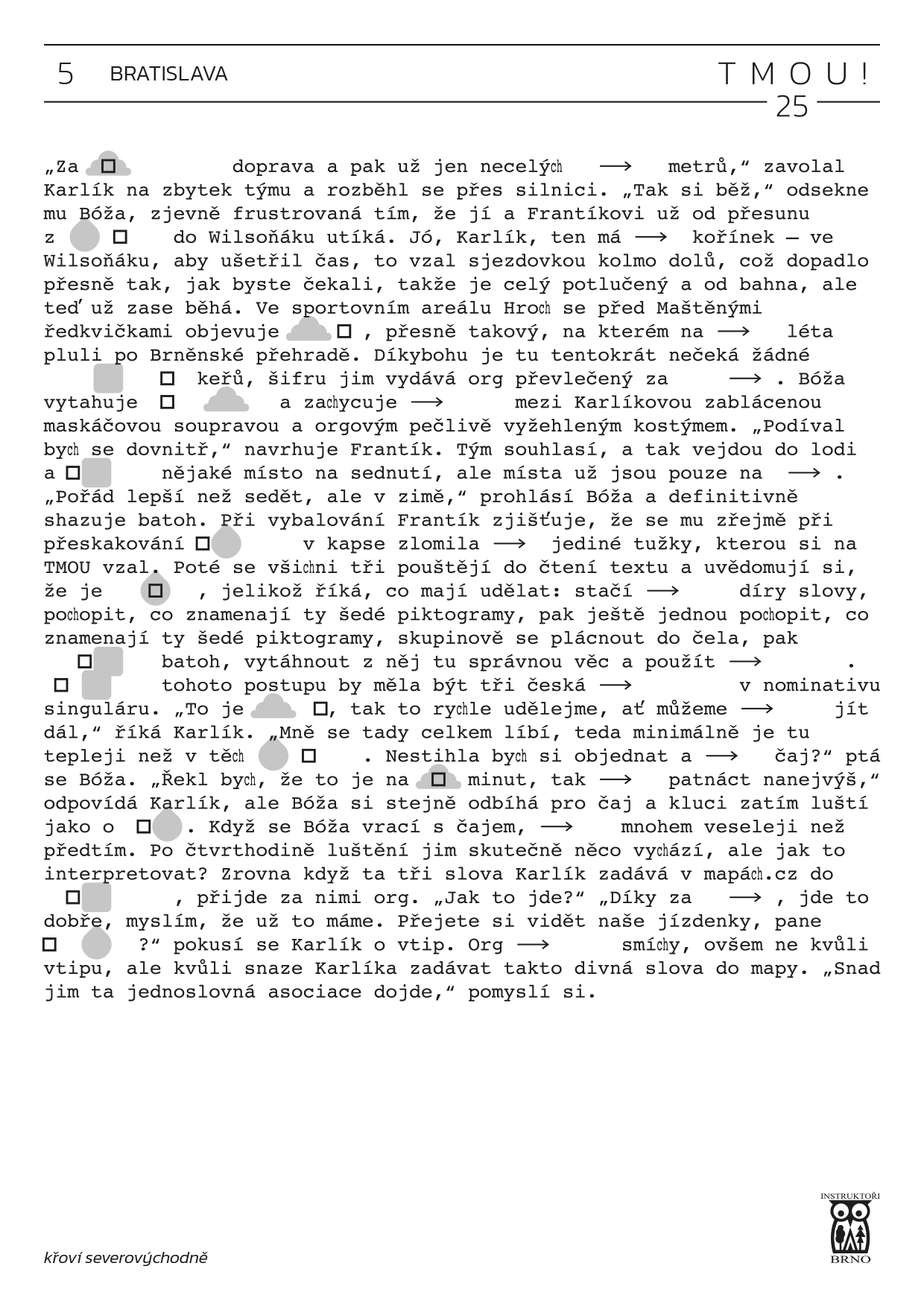 Nejdříve si přečteme příběh Maštěných ředkviček o tom, jak luštily tuto šifru. V textu jsou díry, kam je třeba něco doplnit (text je psán neproporcionálním fontem, tedy jde dobře spočítat počet chybějících písmen). Všimneme si, že pokud na řádku něco chybí, tak jsou to vždy dvě slova, přičemž to levé má na sobě umístěný jeden ze tří šedých symbolů a černý čtvereček a to pravé má na sobě umístěnou šipku. Doplněním několika jednodušších slov zjistíme, že “levá” slova obsahují podslova LED, VOD, PAR, která se vyskytují na symbolech tří skupenství vody (ledu, kapalné vody a páry). “Pravá” slova mají na pozici šipek podslova TÁN, TUH, VYP, KON, SUB a DES, což jsou první tři písmena změn skupenství (tání, tuhnutí, vypařování, kondenzace, sublimace a desublimace). Na každém řádku tedy máme dvojici (skupenství; změna skupenství), přičemž změna skupenství sedí s výchozím skupenstvím (např. za symbolem ledu může být jen TÁN nebo SUB). Každý řádek s dírami tedy obsahuje následující informaci: začtverečkované písmeno, a konkrétní změnu skupenství. Pokud zkusíme přečíst začtverečkovaná písmena, nic zajímavého nedostáváme a nejspíš to nebudou písmena do tajenky, protože nejsou příliš pěkná. Znovu si tedy přečteme příběh a zaměříme se na část, kde Maštěné ředkvičky luští: “(…) pochopit, co znamenají ty šedé piktogramy, pak ještě jednou pochopit, co znamenají ty šedé piktogramy, skupinově se plácnout do čela, pak prohledat batoh, vytáhnout z něj tu správnou věc a použít substituci”. Musíme tedy přijít ještě na nějaký druhý význam těch šedých piktogramů, který souvisí s něčím, co máme v batohu. Šedé piktogramy svou velikostí a barvou totiž připomínají tři geometrické tvary z šifry č. 3. Vytáhneme je z batohu, uvědomíme si, že vlastně kódují substituci mezi třemi „skupenstvími“, vypíšeme si tyto substituce a provedeme je se začtverečkovanými písmeny. Vyjde tajenka UCES VENTIL DRUBEZ, z textu šifry víme, že potřebujeme jednoslovnou asociaci, a tou je Kohout. Jdeme ke stejnojmenné soše v Jundrově.