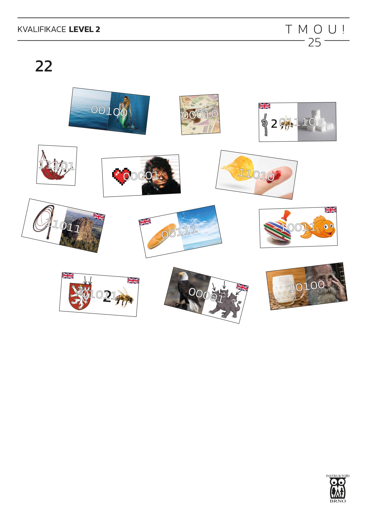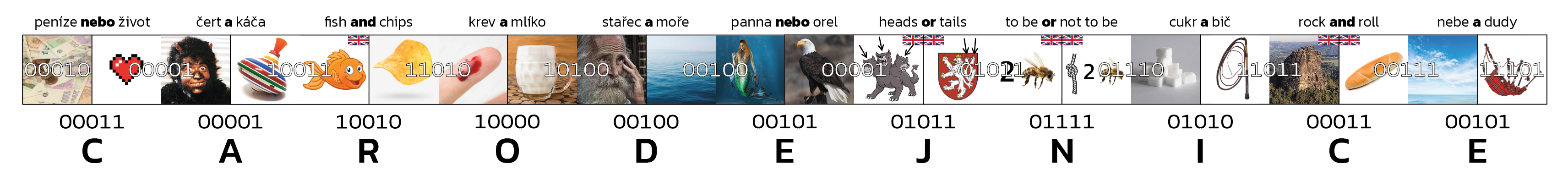 Analýzou tvaru šifry přijdeme na to, že se jedná o domino, musíme dílky tedy nějak spojit. Všimneme si, že obrázky se dají spárovat podle ustálených slovních spojení jako “nebe a dudy” nebo “peníze nebo život”. Občas je třeba obrázky pojmenovat a použít homonymum nebo homofon toho slova. Všechna slovní spojení v sobě obsahují jednu ze dvou spojek “a” nebo “nebo”. Aplikujeme tedy tyto logické operace na binární kódy. Nakonec binárkou přečteme heslo CARODEJNICE.