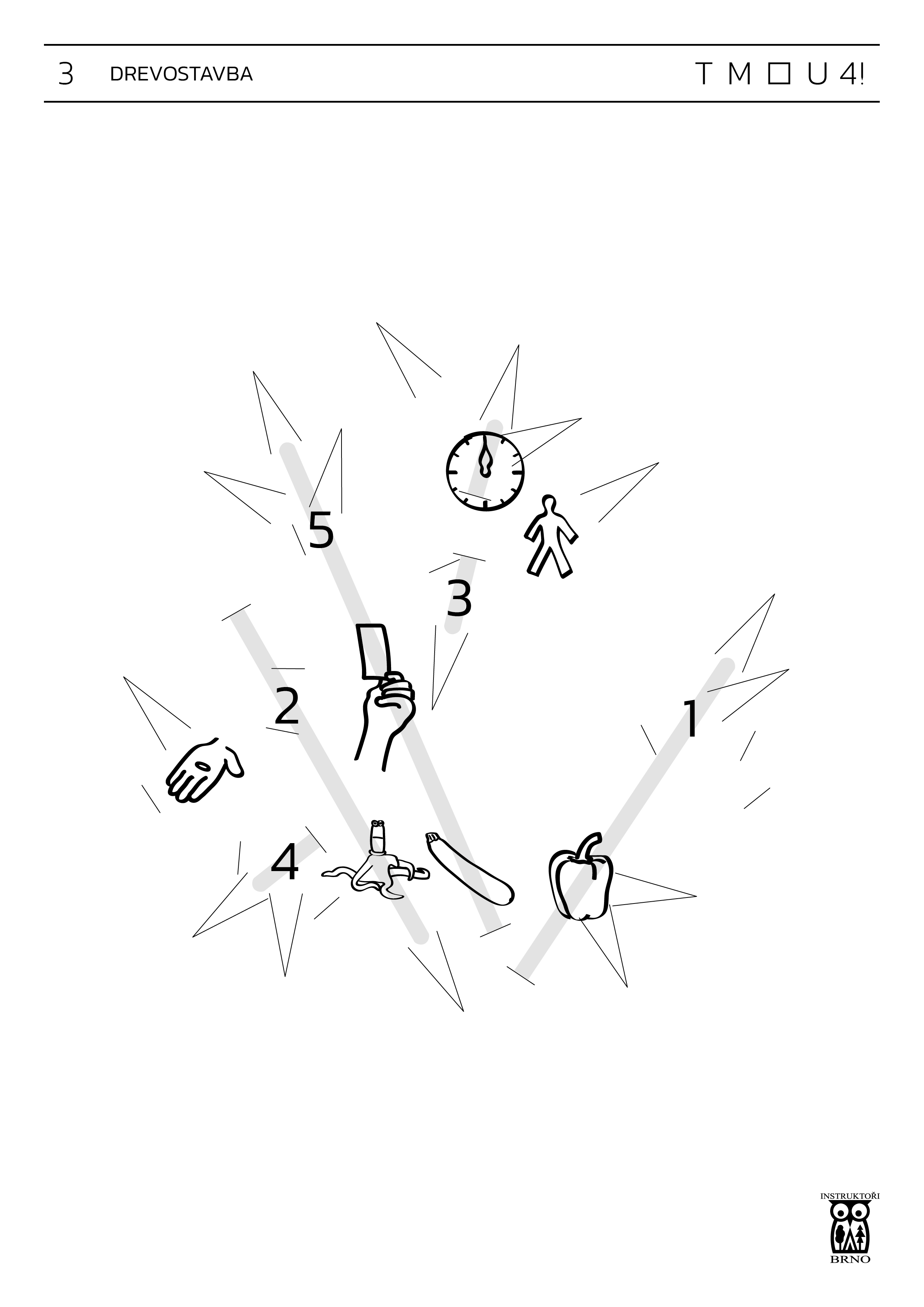 V šifře můžeme identifikovat různé grafické prvky: kreslené obrázky, čísla, tenké linky dvou typů a šedé plochy. Obrázkům lze vždy přiřadit dvou až tříprvkovou podmnožinu barev červená, žlutá, zelená, modrá. Tenké linky připomínají špičky a konce pastelek – zkusíme tedy přiložit pastelky, které jsme dostali na druhém stanovišti, a zjistíme, že sem délkou i počtem pasují. Obrázky se vyskytují vždy na průsečíku tolika pastelek, kolik barev určuje daný obrázek. Čísla 1–5 se vyskytují na průsečíku čtyř pastelek, zde tedy budeme chtít přečíst tajenku pomocí barevných permutací.Musíme tedy pastelky na papír naskládat tak, aby bylo splněno, že na každém obrázku jsou všechny jeho barvy a na každém čísle jsou čtyři různé barvy. Nejdřív tedy řešíme logickou úlohu, jak obarvit jednotlivé půdorysy pastelek. Poté, co se nám to povede, přichází druhá logická úloha, a to jak pastelky poskládat na sebe. Které pastelky jsou v nejnižší vrstvě, nám napovídají šedé plochy. Další vrstvy lze postavit jediným způsobem, aby dřevostavba stála (všechny pastelky jsou vodorovně s podkladem, neklátí se a nelevitují). Poté už můžeme z permutací barev na číslech 1–5 přečíst od horní vrstvy dolů tajenku ZIVLY, což je název nedaleké sochy.