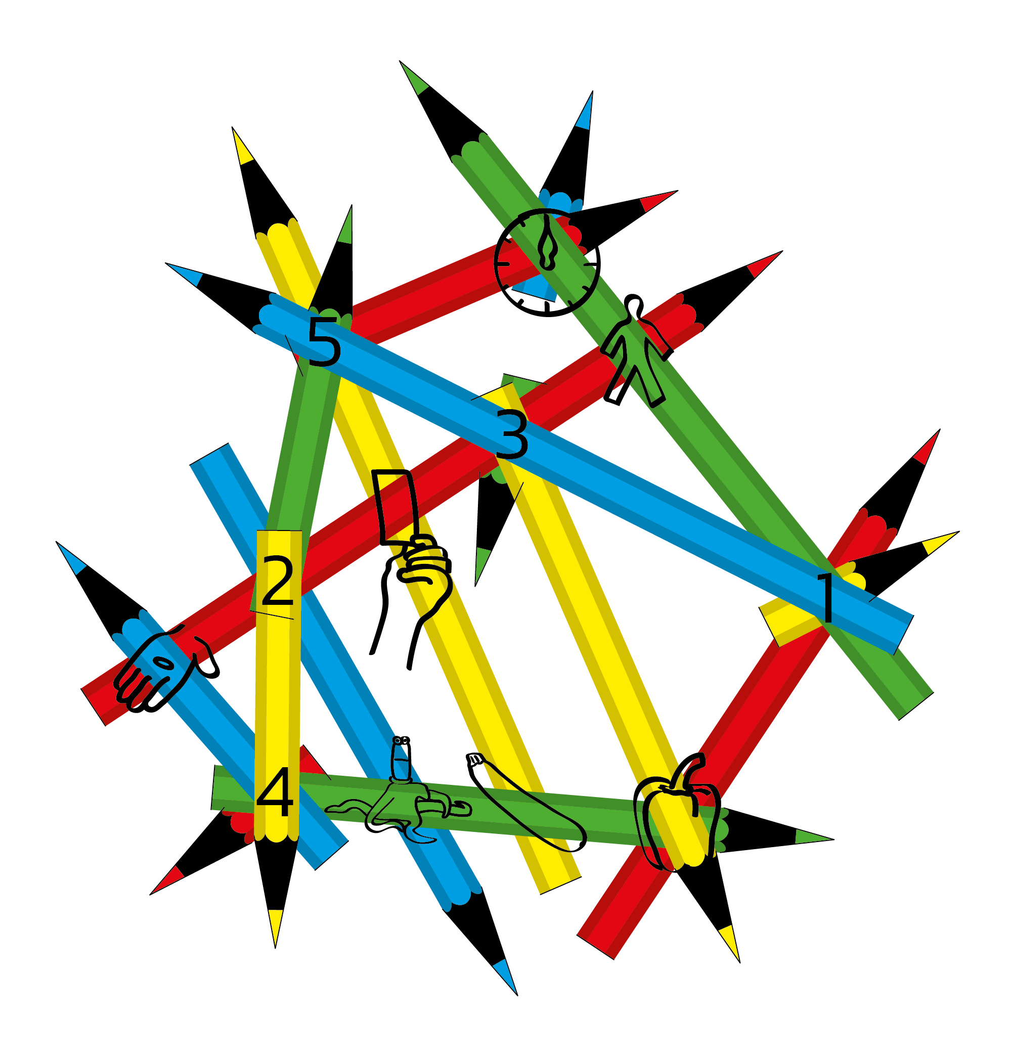 K luštění je potřeba sada šestnácti pastelek, které dostaly týmy na druhém stanovišti. Můžete si je nasimulovat vystřihnutím z papíru, ale je třeba počítat s tím, že představují 3D objekty.