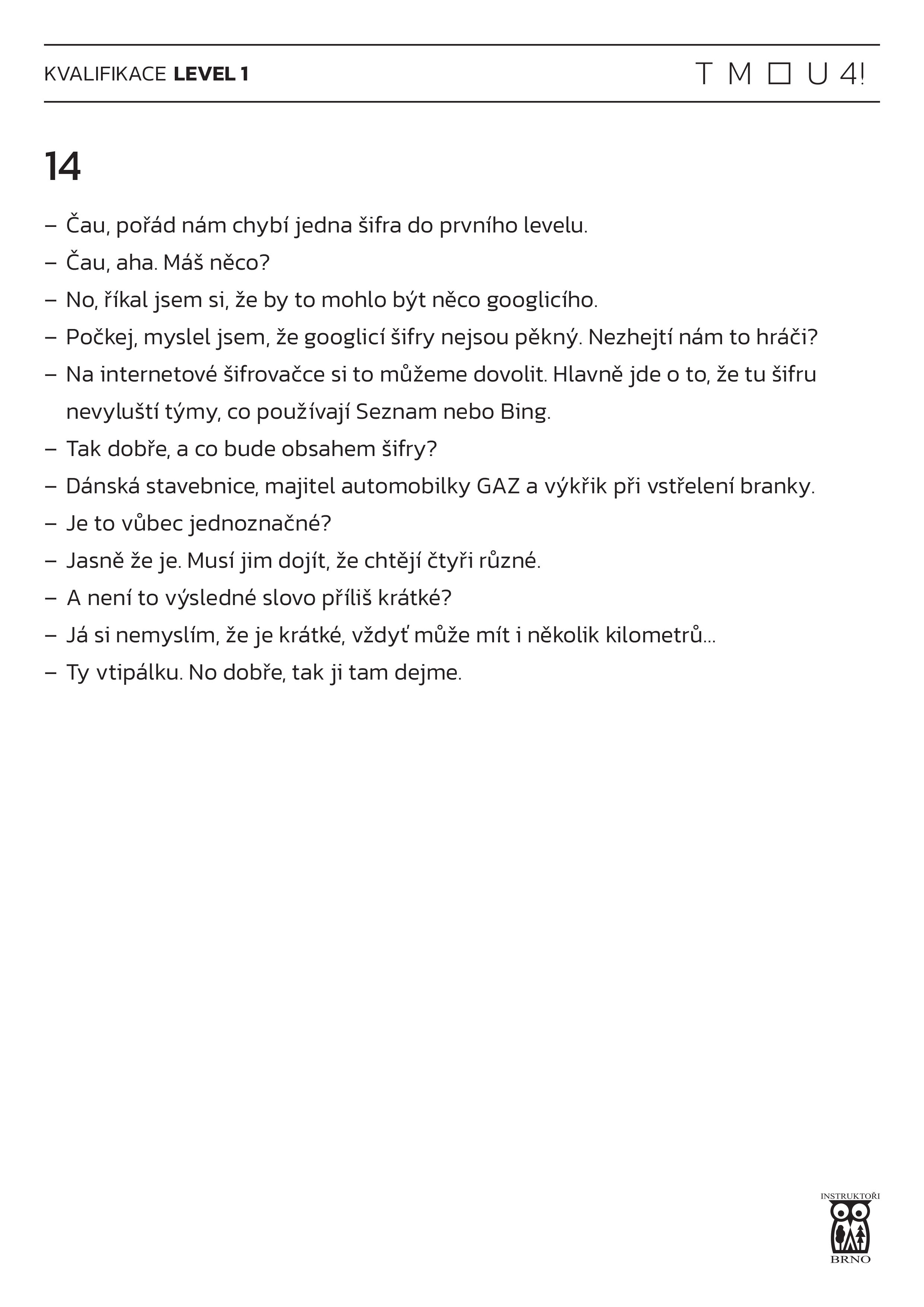 Na hře se používala TMOU 4! pomůcka a 24písmenná anglická abeceda bez Q a W. Řešením šifry je podstatné jméno v prvním pádě.