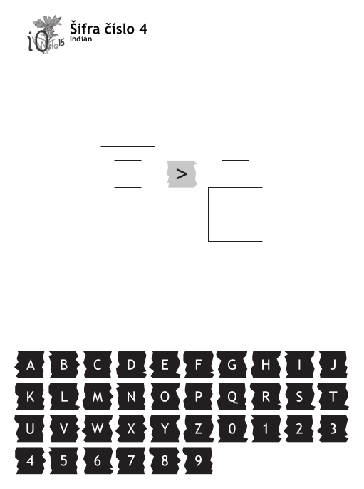 Na jednom papíře máme definici 36 alfanumerických znaků jako zubatých kousků černé pásky a záhadné schéma. Na druhém spoustu obrázků, které mají stejnou formu zubatých kousků pásky. Nebo dvou pásek, protože jsou dvou velikostí. A dva obrázky kdovíproč někdo vystříhl a zůstaly po nich jen díry. Obrázky jsou každopádně zábavnější.