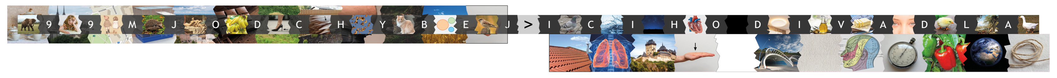 Když si dost obrázků pojmenujeme, začneme nacházet známá slovní spojení podle vzoru něco v něčem nebo něco na něčem. První slovo je vždy na malém obrázku, druhé na velkém. To umožní pojmenovat správně všechno, čímž dostáváme dvě sady 12 dvojic obrázků. Všimneme si, že okraje velkých obrázků navazují (malých ne). Můžeme proto vytvořit dvě souvislé řady: