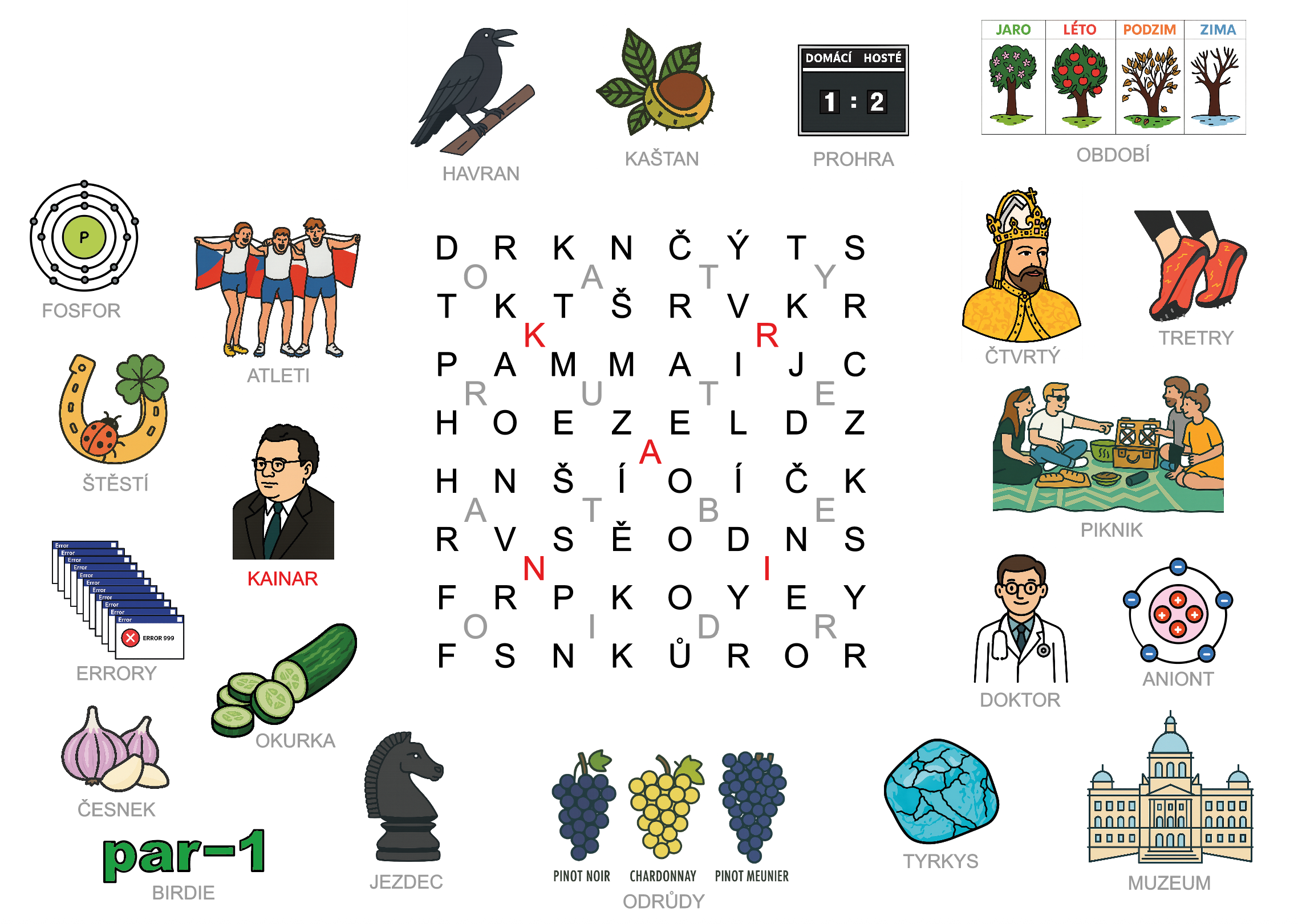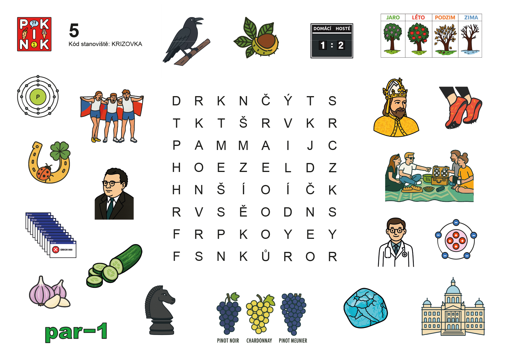 Pojmenujeme obrázky a zjistíme, že jsou to šestipísmenná slova. V tabulce písmen se je najít nedaří, ale můžeme si všimnout podezřelých shluků jako například DRTK připomínající DOKTOR. Zjistíme, že v tabulce najdeme vždy první, třetí, čtvrté a šesté písmeno, vždycky tedy chybí druhé a páté písmeno, které je dokonce stejné. Uvědomíme si, že stejný princip je v logu Pikniku a chybějící písmeno vždy dopíšeme mezi čtyři písmena.