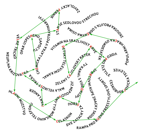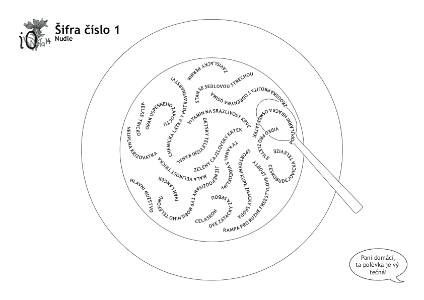 Texty ve tvaru nudlí vždy popisují nějaké písmeno (céčko, éčko, atd.). Toto písmeno je v dané nudli vždy právě jednou, což jistě není náhoda: