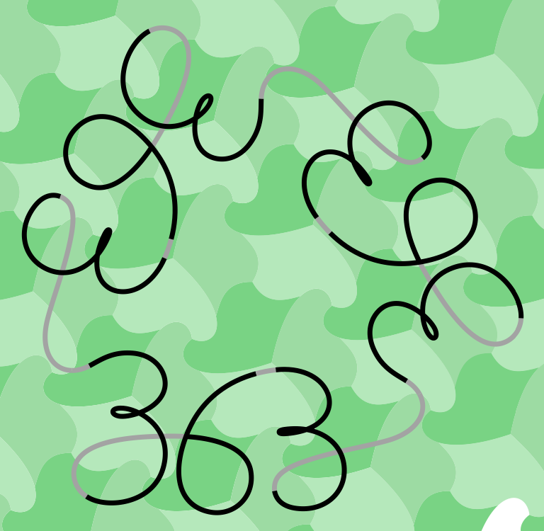 Útvar lze přikládat sám k sobě a při přiložení navazují čáry na okraji. Můžeme tedy útvarem vydláždit rovinu, což rozvine kousky čáry do jedné dlouhé křivky. Vystřihneme obě kopie, přikládáme a vedle (nebo na fólii) kreslíme křivku. Z křivky přečteme její černou část: 363. Když si ji rozkreslíme úplně celou, její hrubý tvar je trojúhelník, což je mapový symbol kóty. Jdeme tedy na tedy blízkou kótu 363.