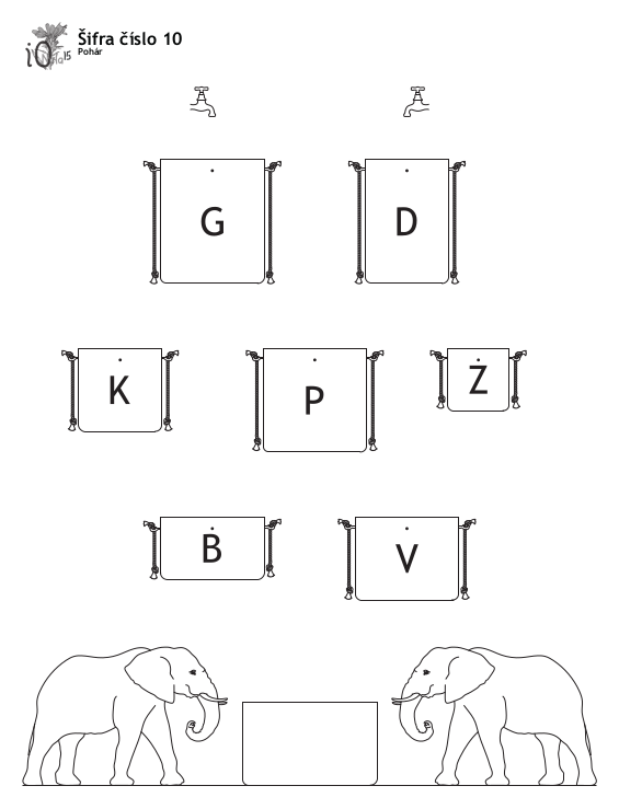 Šifra má dvě části, řadu obrázků a schéma s nádobami, písmeny, slony a kohoutky. Sloni a kohoutky jsou i mezi obrázky. Když pojmenujeme obrázky, vidíme, že kromě slonů a kohoutků jejich fonetické přepisy obsahují právě jednu slabikotvornou souhlásku L nebo R, před kterou se ve slabice nachází jedno z písmen {G,D,K,P,Z,B,V} na nádobách. L a R může znamenat levý a pravý. I sloni a kohoutky jsou na obrázcích leví a praví.