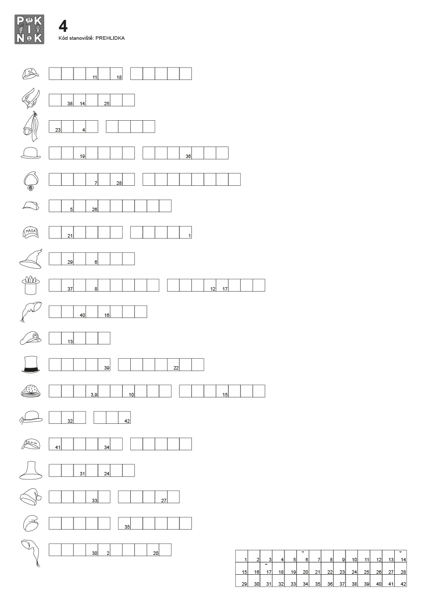 Nejdříve pojmenujeme majitele jednotlivých klobouků, pomáhá nám s tím počet chlívků a abecední řazení řádků. Potom pomocí indexů vyplníme tabulku v pravém dolním rohu šifry. Přečteme si mezitajenku POHLEĎ VZHŮRU AŤ VÍŠ JAKOU BARVU NAHMATÁŠ POSLEPU. Pokud jste zůstali luštit poblíž stanoviště a pohledíte vzhůru, uvidíte logo Red Hatu, ve kterém je… počkejte si… červený klobouk.