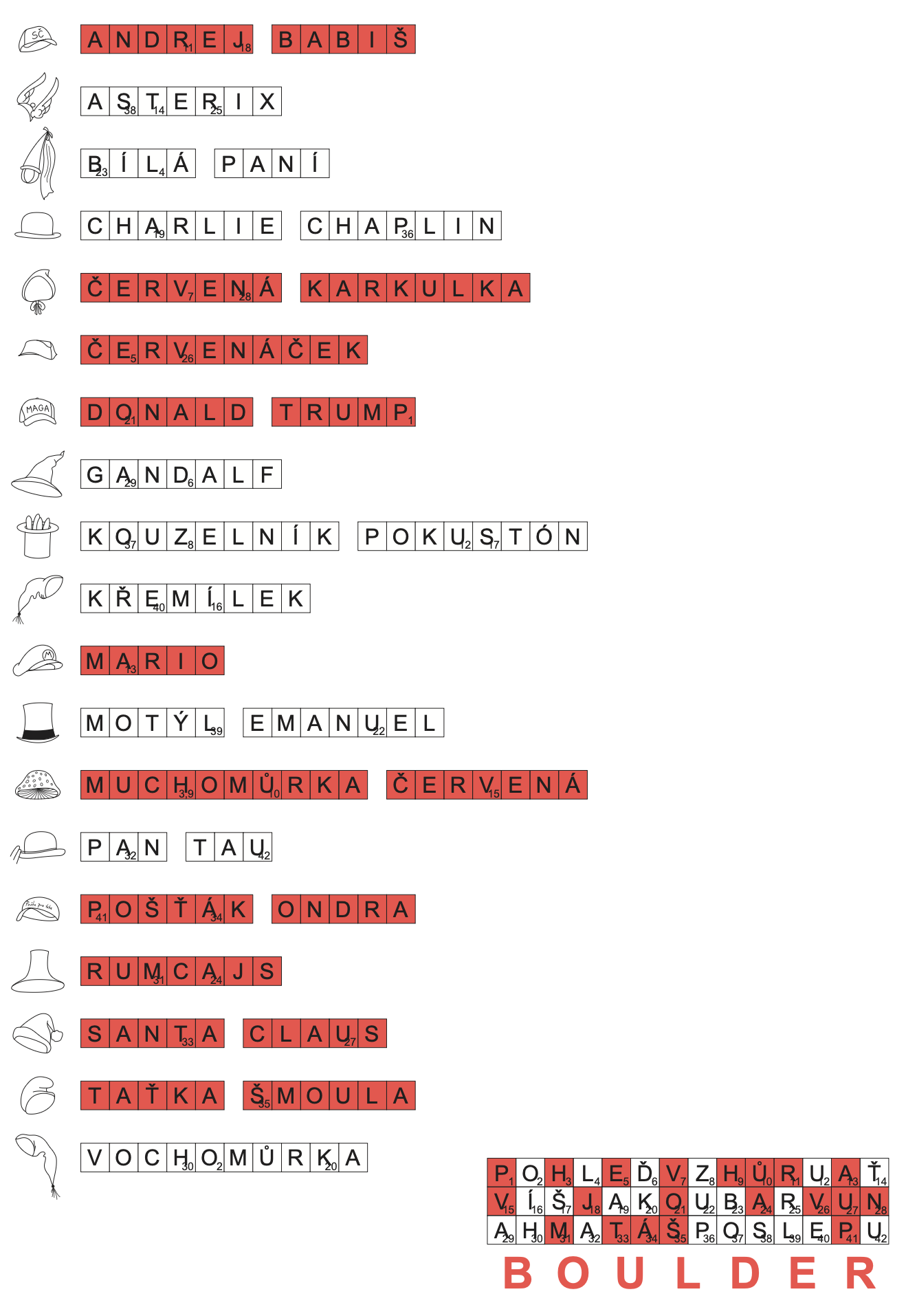 Identifikujeme, které klobouky jsou červené a písmenka, která jsme vybrali z jejich názvů, zvýrazníme v tabulce s mezitajenkou. S pomocí mezitajenky či podezřelého třířádkového rastru přijdeme na to, že druhý krok je přečíst Braillovo písmo. Sedmipísmenná tajenka zní BOULDER, což je nedaleký lezecký objekt (a podle Map.com socha).