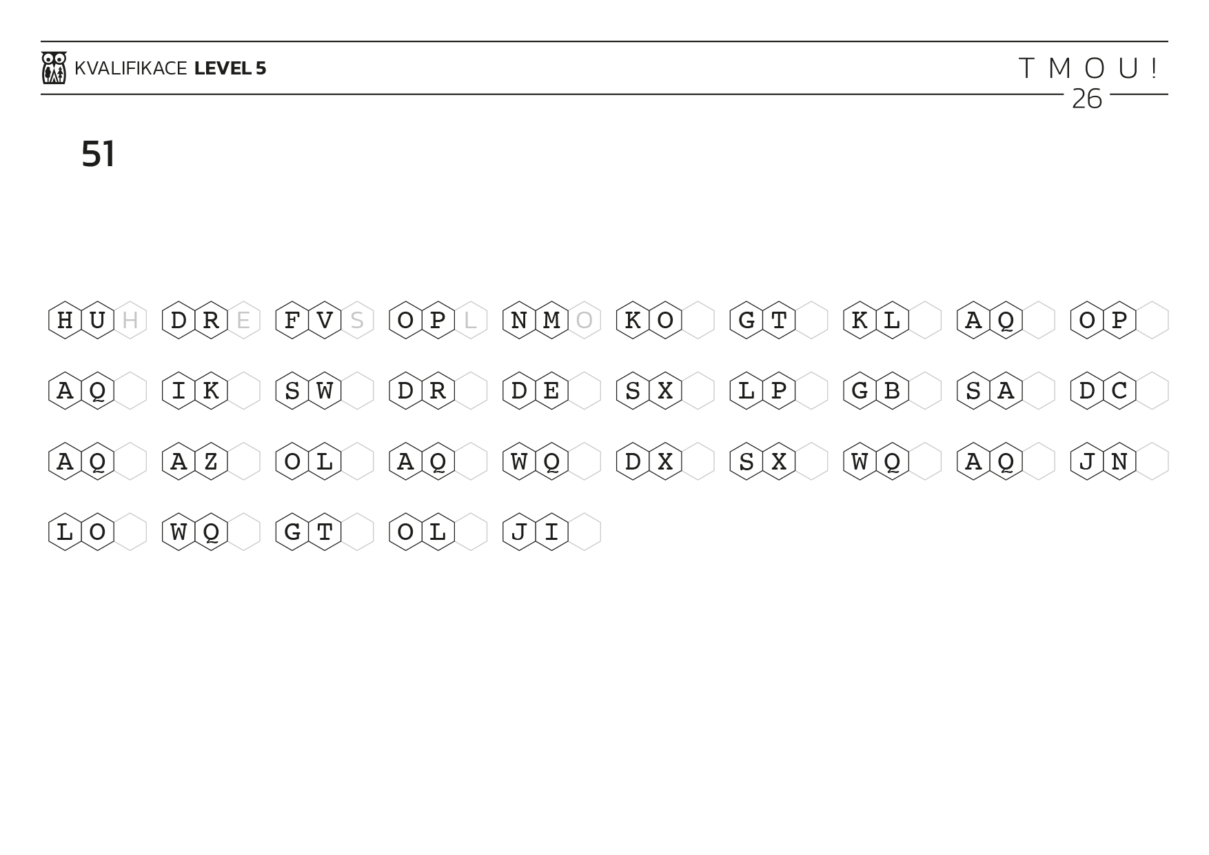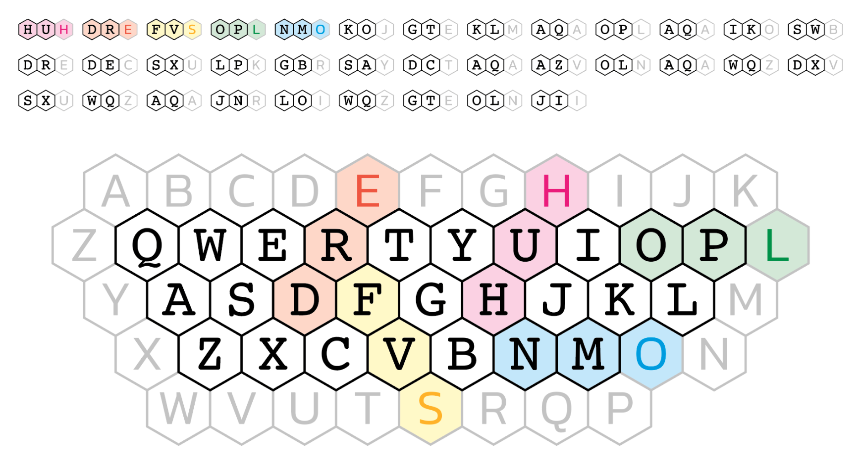 Pokud si klávesnici zakreslíme do šestiúhelníkové sítě a zkusíme pokračovat v číslování/písmenkování po směru hodinových ručiček, zjistíme, že i další písmena z „HESLO“ jsou na správné pozici a celou klávesnici obalí právě 26 šestiúhelníků. Teď už jednoduše přečteme chybějící šedá písmena – získáme mezitajenku HESLO JE MALA OBEC UKRYTA V NAZVU ZARIZENI, heslo je tedy VESNICE (případně VES).