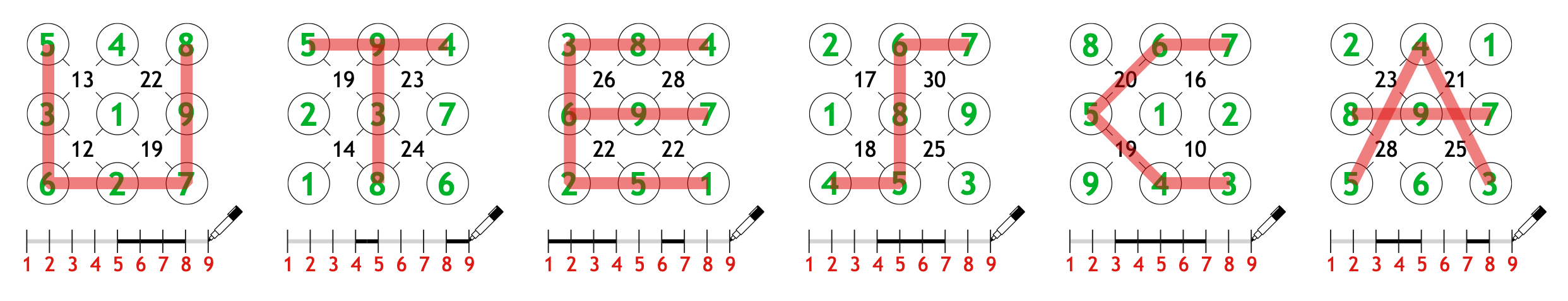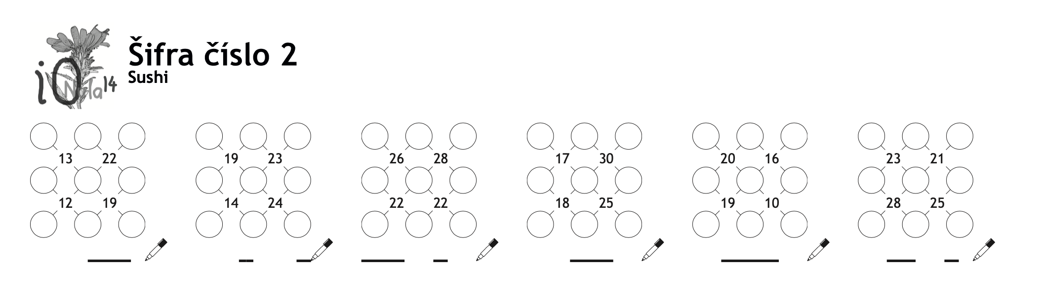 Čísla v zadání naznačují, že budeme pracovat s čísly – nejspíš musíme nějaká vepsat do koleček. A nejspíš si musíme nějaké pravidlo domyslet, a to poměrně silné, protože jinak nám čtyři čísla obsah devíti koleček jednoznačně určí stěží. Čím jsou zajímavá čísla 10 až 30? Ve spojení s devíti kolečky a s tím, že hledáme další pravidlo, nás může napadnout, že to jsou součty čtveřic různých čísel 1 až 9. Doplňujeme tedy čísla 1 až 9 tak, aby dvojciferná čísla byly součty čtyř doplněných čísel kolem nich. Je to netriviální úloha, ale jde to. Komu to šlo špatně, tomu pomohli orgové doplňující správná čísla na vámi vybrané posice.