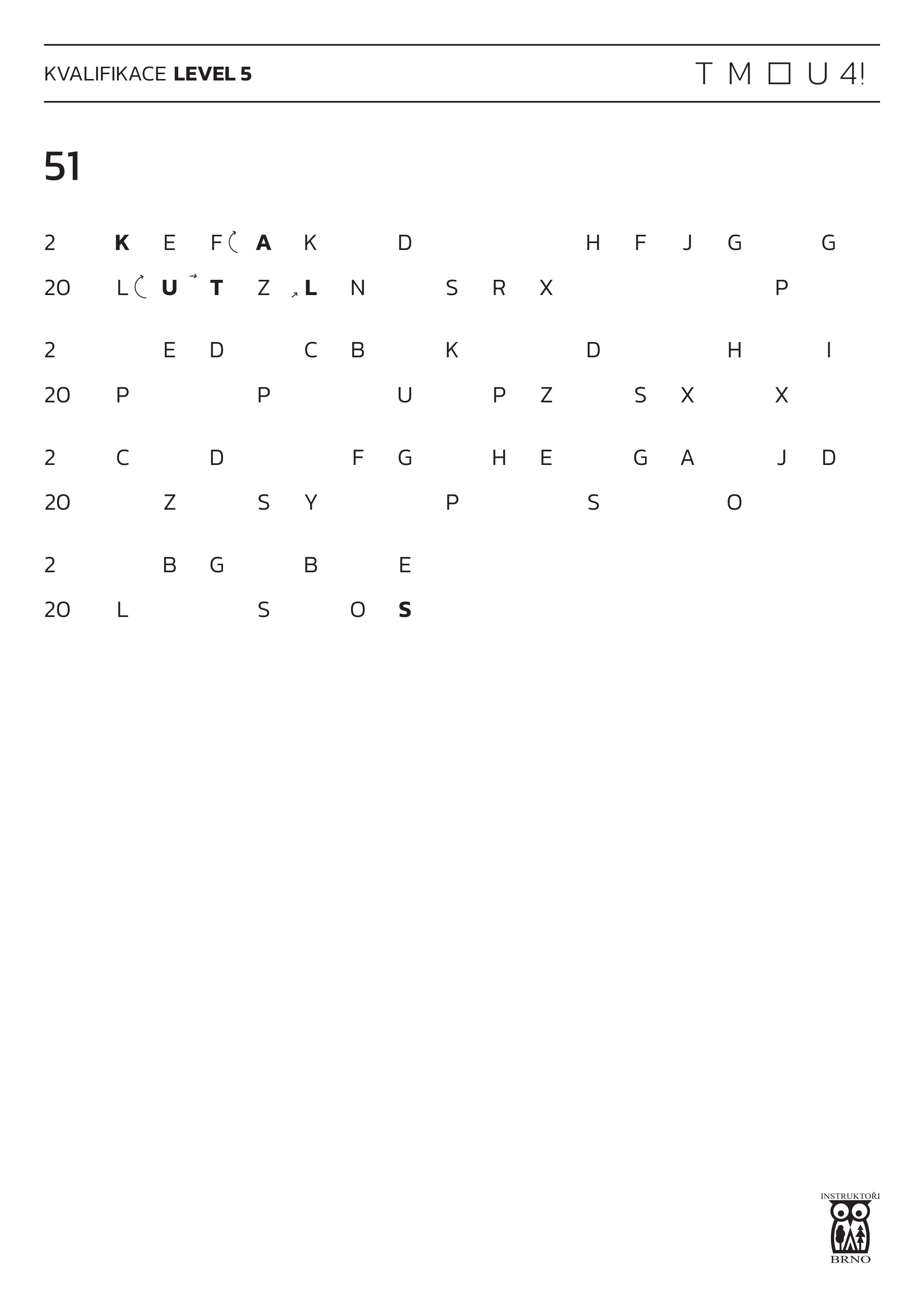 Na hře se používala TMOU 4! pomůcka a 24písmenná anglická abeceda bez Q a W. Řešením šifry je podstatné jméno v prvním pádě.
